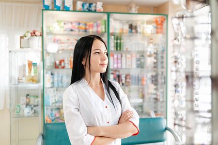 Medicine, pharmacy and optics. Portrait of a woman doctor or pharmacist in a white coat, looking away with a smile. In the background, a showcase with drugs and glasses