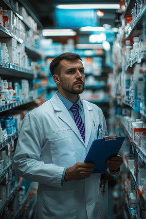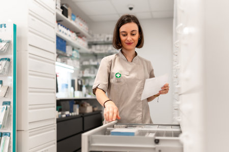 Pharmacist in a well-stocked pharmacy carefully checking medications and inventory records daily.