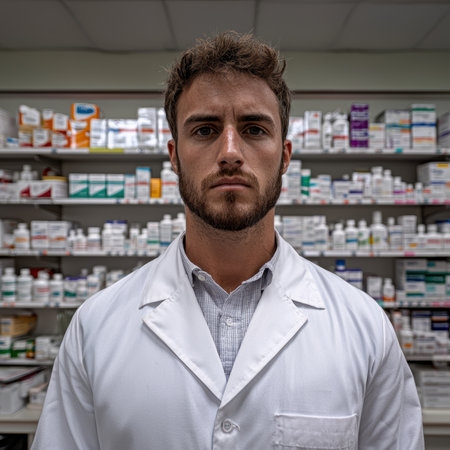 A young pharmacist with dark hair stands in a drugstore. Behind the pharmacist, shelves are stocked with many kinds of medicines and health items. The setting shows a busy pharmacy.