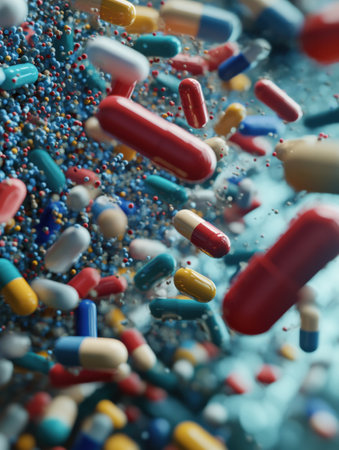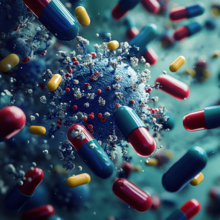 Pills move energetically around bacteria, symbolizing the ongoing battle against disease and showing advancements in medicine and health.