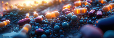 Pills surround bacteria, illustrating the progress of medicine in combating infections and promoting health through treatment innovations.