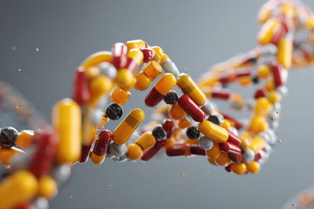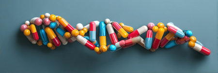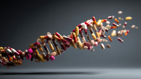 Pills and capsules in vibrant colors form a striking DNA helix, symbolizing the connection between medicine and genetics in a health-conscious world.