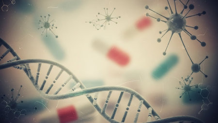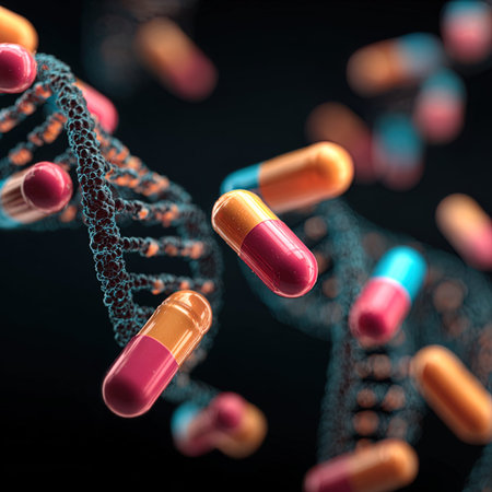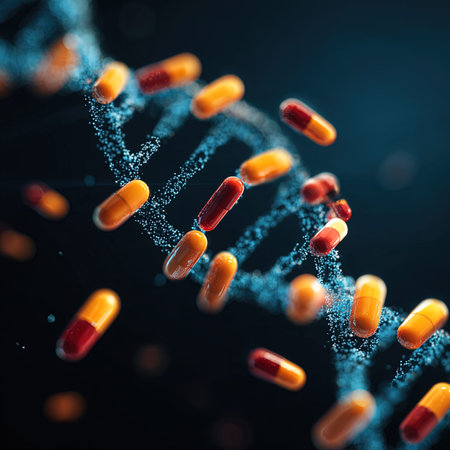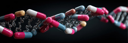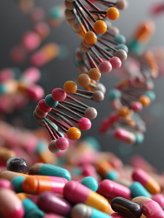 Colorful capsules scattered around swirling 3D DNA spirals illustrate the intersection of medicine and genetics, emphasizing their connection and importance.