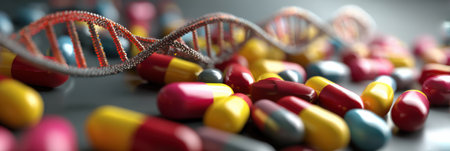 Colorful medicine capsules scatter across a surface, intertwined with floating 3D DNA spirals, showing the link between genetics and healthcare innovation.