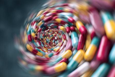 A vivid mix of capsules spins in a swirling motion, showing an array of colors including red, blue, yellow, and green in a dynamic pattern.