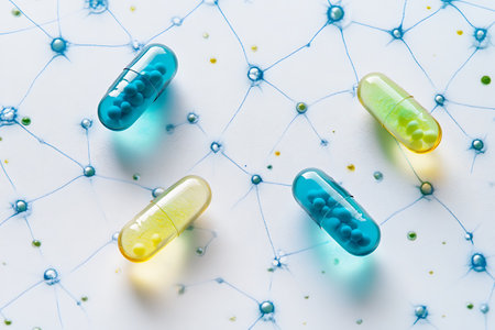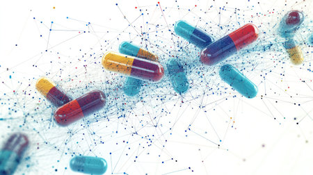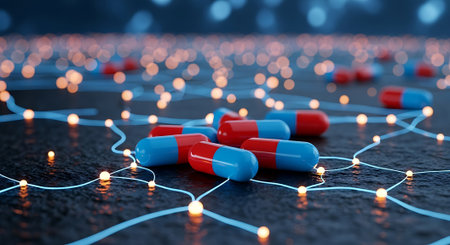 A conceptual illustration featuring several red and blue pharmaceutical capsules scattered across a textured dark surface The capsules are highlighted by a network of interconnected light blue lines and glowing nodes creating an abstract representation of medical networks or technological advancements in healthcare The depth of field effect emphasizes the foreground capsules while creating a bokeh effect in the background with numerous light points This image can be used to represent pharmaceutical research medical technology and healthcare solutions