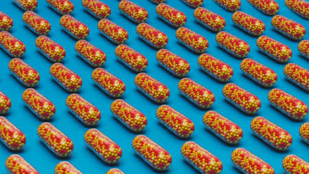 Medical concept. Red pills and capsules on the conveyor belt. Disease X.