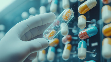 Capsules float in a modern digital landscape, representing advanced medical technology and innovation.