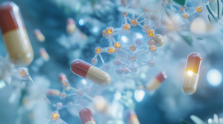 Scattered blue and white medical capsules on a light blue surface with a molecular structure diagram, highlighting pharmaceutical research