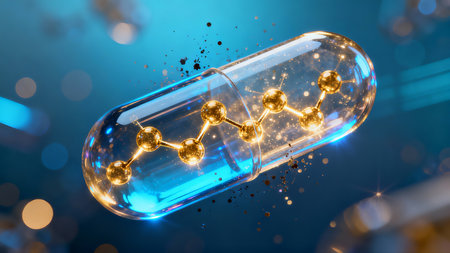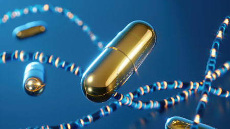3d illustration of blue capsule with golden molecular structure over blue background