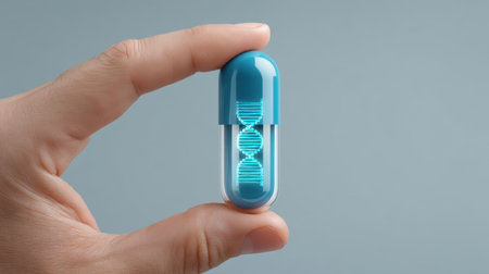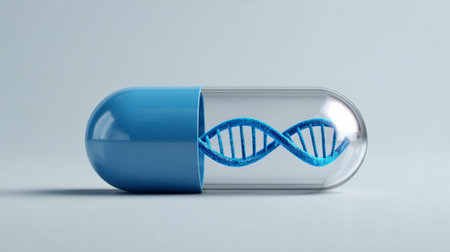 Dna helix structure contained within a half open blue and transparent capsule, symbolizing genetic medicine, biotechnology, and personalized healthcare solutions for advanced treatments