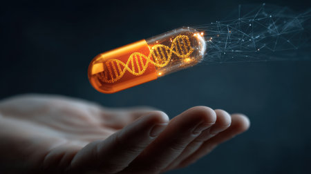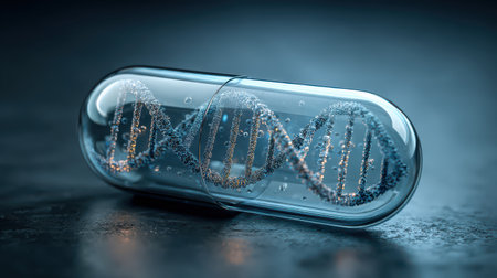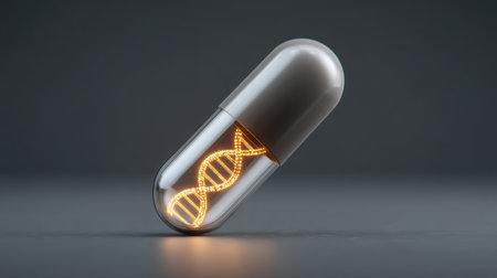 A captivating image showcasing a futuristic capsule containing a glowing DNA strand, symbolizing advancements in medical technology and genetics.