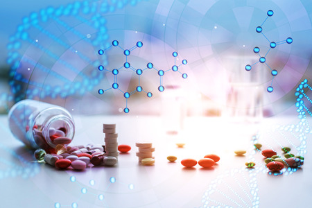 3d rendering of a medical background with dna molecule and pills