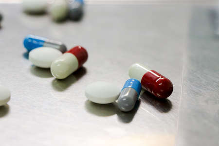 Healthcare and medical concept. Heap of different pills, tablets pouring in the stainless plate