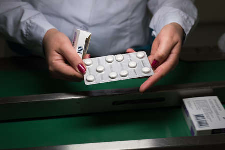 Female pharmacist hand choosing medication in drugstore. Focus on foreground