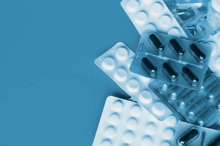 Blister frame with pills and blue background. Copyspace.