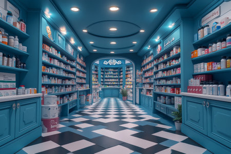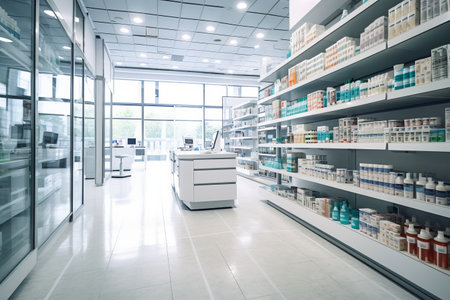 An image shows the clean and organized interior of a modern pharmacy, with neatly arranged shelves displaying various pharmaceutical products. Generative Ai