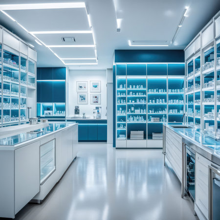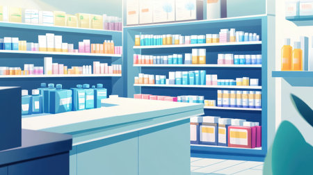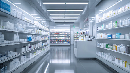 Modern pharmacy interior with clean, fully stocked shelves of medications and products, symbolizing healthcare, organization, and retail in the pharmaceutical industry.