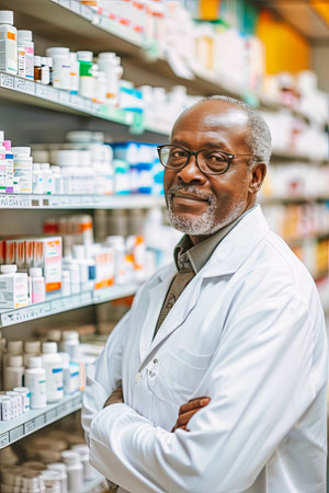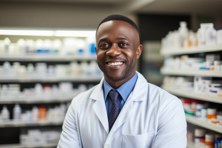 Confident African American male pharmacist in a white coat posing in a well-stocked pharmacy, representing healthcare professionalism.