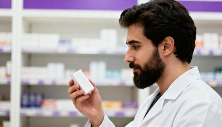 Side view of a bearded pharmacist holding a bottle of medicine in his hands