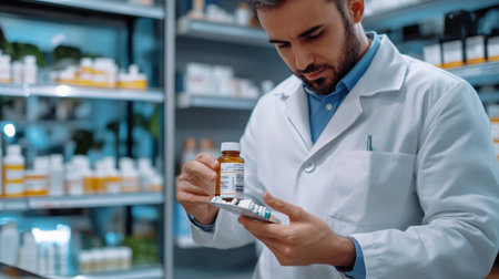 Handsome pharmacist is holding a medication while working in pharmacy