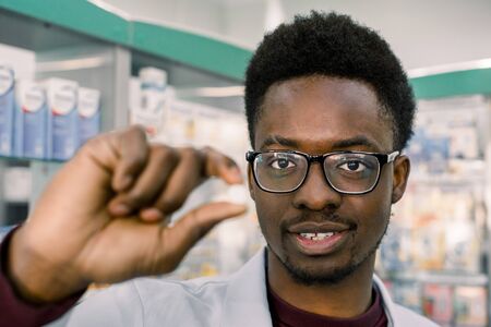 Young smiling African-american Doctor pharmacist man holding white tablet pill in the hand, close-up. Focus on the face