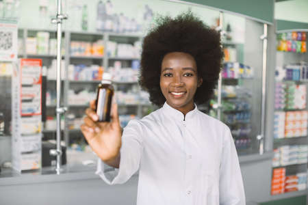 Confident smiling African woman, medical physician doctor or pharmacist posing over hospital pharmacy background, holding bottle of medicine in hands. Focus on face.