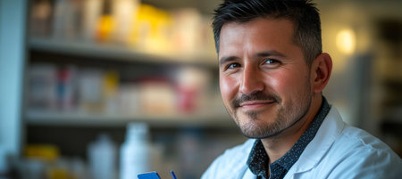 Smiling Pharmacist with Clipboard in Pharmacy Healthcare Professional with a Bright Demeanor