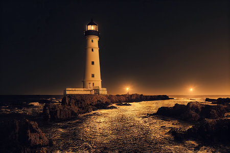 In the deep of night, a solitary lighthouse stands as a steadfast beacon of hope. Its powerful beam cuts through the atmospheric haze, offering guidance and a promise of safety to those navigating the dark, uncertain waters. A symbol of strength and resilience against the storm.