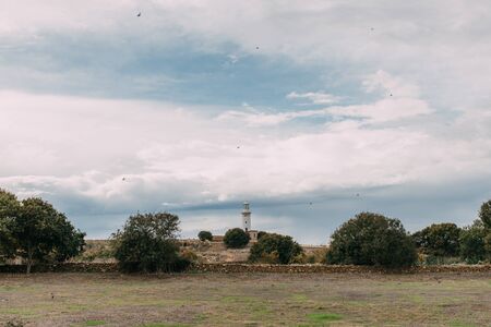 Old white lighthouse and ancient theatre ruins near the deep blue sea