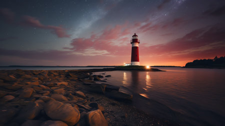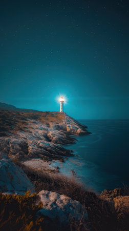 A beautiful lighthouse standing tall on a rocky coastline under a starry night sky. The beam of light cuts through the darkness, illuminating gentle waves and creating a serene atmosphere. Perfect for capturing peaceful maritime moments.
