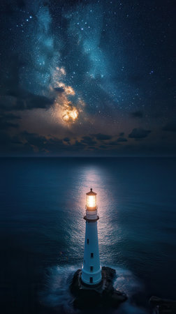 This serene image showcases a coastal lighthouse at night, its warm light cutting through the tranquil waters below a star-studded sky, evoking peace and guidance.