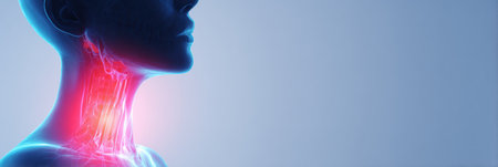 This visual representation illustrates the discomfort of a sore throat through glowing throat effects, set against a minimalist background for enhanced focus.
