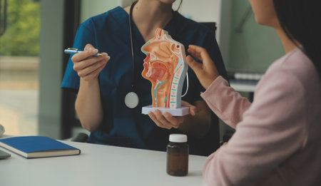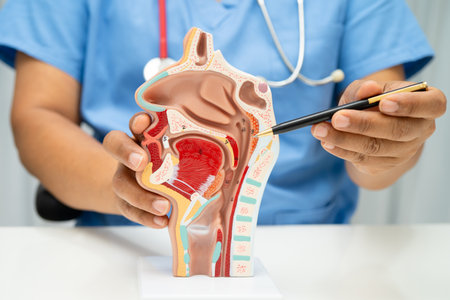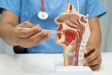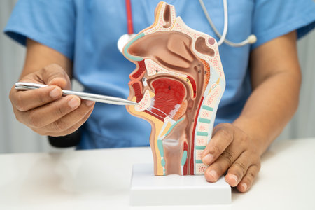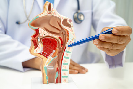 Asian doctor with nasal oral throat cavity neck human anatomy model for study diagnosis and treatment in hospital.