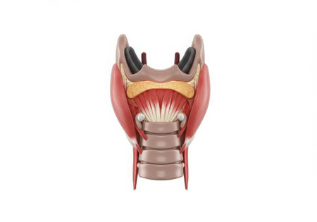 A detailed anatomical model of the human larynx and upper trachea, showcasing cartilaginous structures and vocal cords, isolated on a white background.