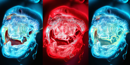 Digital illustration of human skull and brain in neon colors, anatomical study. Science and technology concept