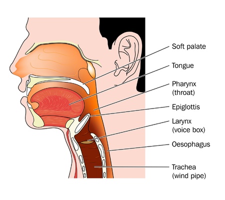 Detailed crosssectional view of upper airway anatomy highlighting tongue and soft palate positioning with pharyngeal narrowing during sleep on a clean white background.