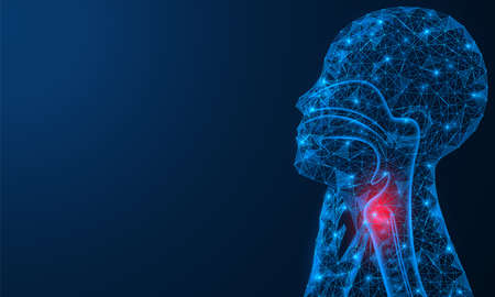 Redness and sore throat. A person touches a sore neck. A low-poly construction of interconnected lines and dots. Blue background.