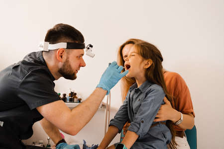 Oropharyngoscopy family procedure for child. Mother with daughter visit ENT doctor. Otolaryngologist examines child throat with spatula. Family consultation with laryngologist