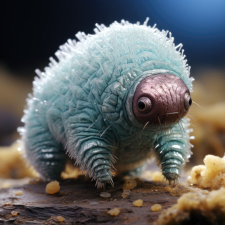 A highly detailed close-up of a dust mite with its claws gripping a fabric thread, captured on a neutral background.