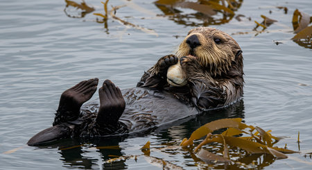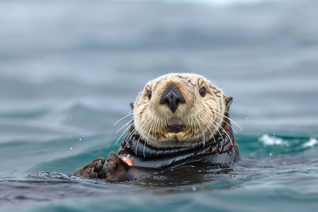 Digital artwork of photo of a sea otter swimming in the ocean, eating fish with its head above water along the california coast.