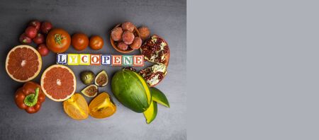 Fruits and vegetables containing lycopene. Healthy vegan food background. Lycopene is a red carotenoid pigment