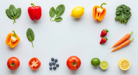 flat colored background with cut vegetables and fruits