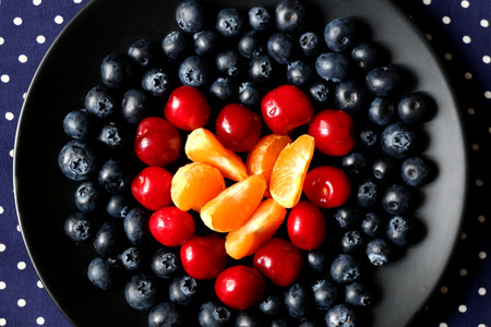 Strawberries, cherries and tangerines on black plate with dotted tablecloth. Top view.