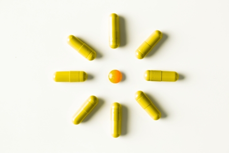 Pill vitamins alternative medicine, top view and space for text