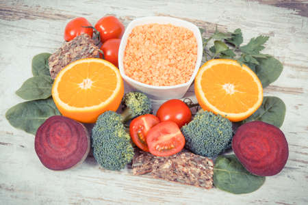 Nutritious different ingredients containing vitamin B9, dietary fiber, natural minerals and folic acid, healthy nutrition concept