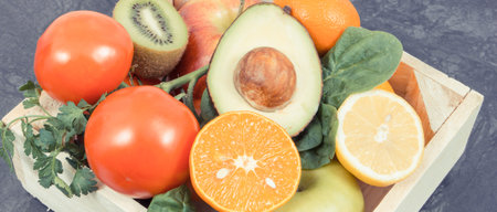 Fresh ripe natural fruits with vegetables as food containing healthy minerals and vitamins