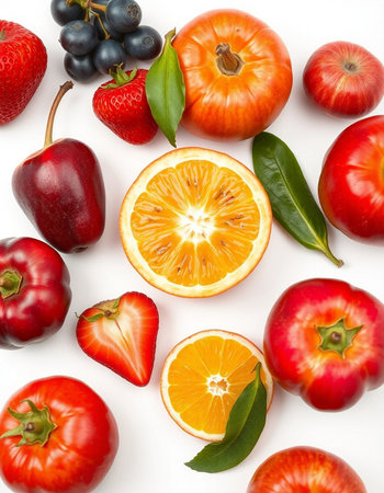 Fruits and vegetables isolated on white background. Top view. Flat lay pattern