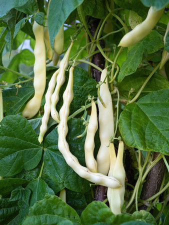 Ripe pods of kidney bean growing on farm. Bush with bunch of pods of haricot plant (Phaseolus vulgaris) ripening in homemade garden. Organic farming, healthy food, BIO viands, back to nature concept.