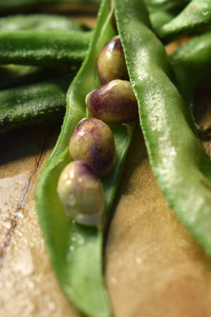 fresh purple string beans on a black wooden table, clean eating,selective focus